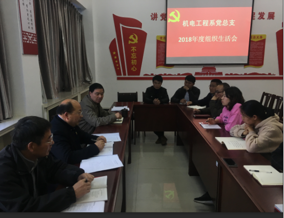 会议按照校党委下发的《关于召开2018年度基层党组织组织生活会和开展党支部分类定级、民主评议党员的通知》文件要求进行。系党总支书记翟迎朝同志主持会议。他代表系党总支作对照检查,对一年来的党建工作进行总结,同时结合党总支部和个人实际,开展自我批评,深入查摆在遵守政治纪律、作风建设、履行职责、落实组织生活会制度等方面存在的问题,剖析问题产生的原因,制定整改措施。