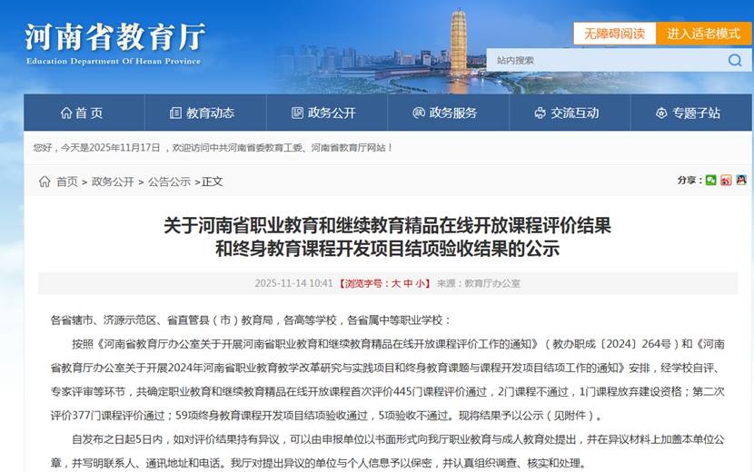 近日,河南省教育厅公布2024年职业教育和继续教育精品在线开放课程评价结果,yl9193永利集团《纯电动汽车整车故障诊断与维修》《单片机技术及应用》《机械绘图与识图(一)》三门精品在线开放课程通过首次评价,《自动化生产线安装与调试》精品在线开放课程通过第二次评价,彰显了学院在课程建设与教学改革领域的硬核实力。