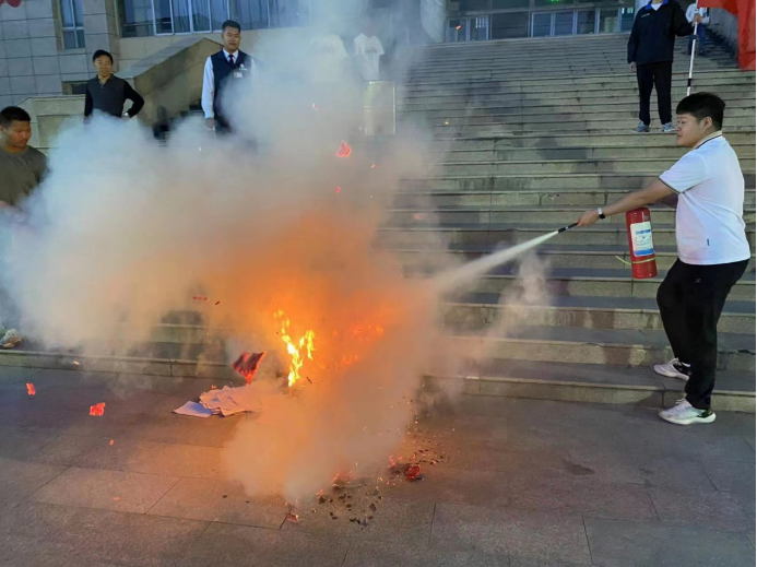 随后在学院实训广场举行了消防演练,贺钞锋教员详细介绍了灭火器的使用方法和注意事项,并亲自进行了示范,然后面对熊熊烈火,多名学生亲自使用灭火器进行了灭火演练。
