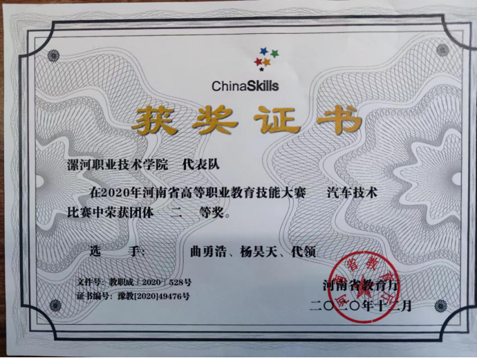 2020年河南省高等职业教育技能大赛汽车技术赛项二等奖。
