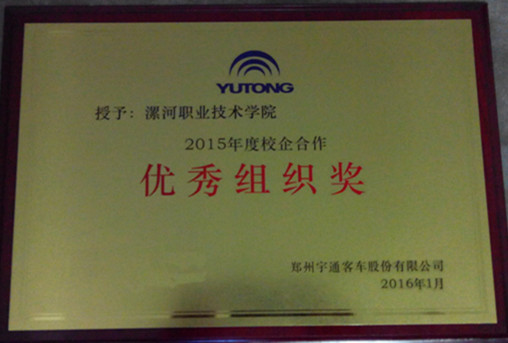 2016年1月8日下午,宇通客车股份有限公司2015年度校企合作优秀合作院校颁奖仪式在宇通公司隆重举行,由于双方融洽的合作关系,机电工程系荣获宇通客车2015年度校企合作优秀组织奖,部分在公司就业学生荣获优秀员工等奖项。