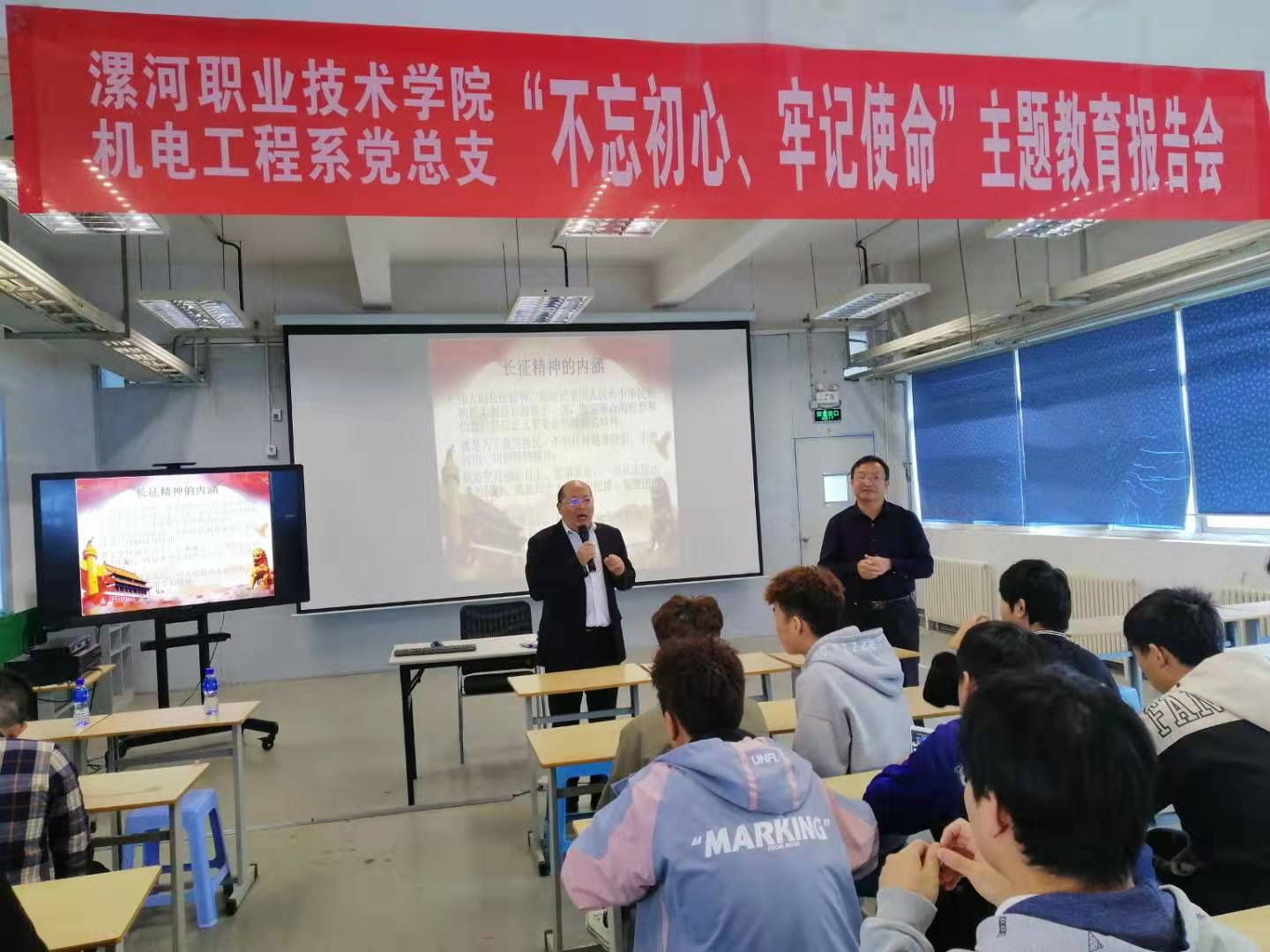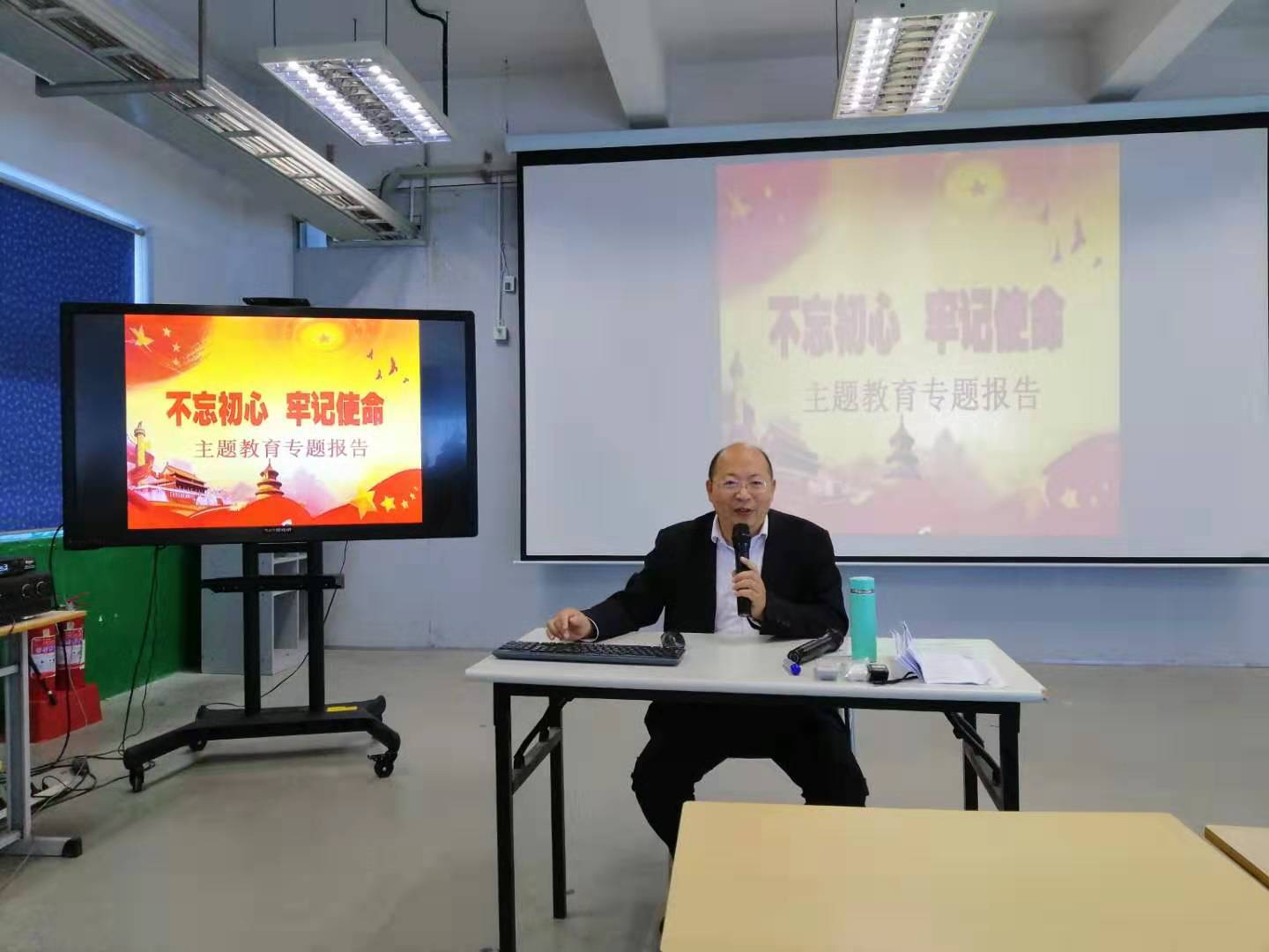 在烟台富士康科技集团工业园区的培训教室,系党总支书记翟迎朝做了题为《不忘初心、牢记使命,走好新时代的长征路》的专题党课。翟迎朝在党课中指出,开展“不忘初心牢记使命”主题教育一是要深刻理解“不忘初心、牢记使命”的丰富内涵,二是“不忘初心牢记使命”就要知道我们是从哪里走来,三是“不忘初心、牢记使命”是中国共产党人新时代的宣言,四是“不忘初心、牢记使命”,全面加强党的建设,永葆党的先进性和纯洁性,五是“不忘初心、牢记使命”,奋力走好新时代的长征路,六是“不忘初心、牢记使命”,做合格的共产党员。