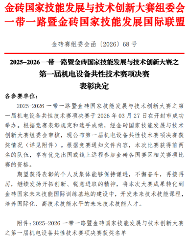 3月27日—30日,2025-2026一带一路暨金砖国家技能发展与技术创新大赛第一届机电设备共性技术决赛在开封职业学院隆重举行。来自全国多所院校80余支参赛队伍齐聚一堂,围绕机电设备共性技术展开激烈角逐。yl9193永利集团智能控制技术专业的学生张家祥和吴岩参赛并获佳绩。